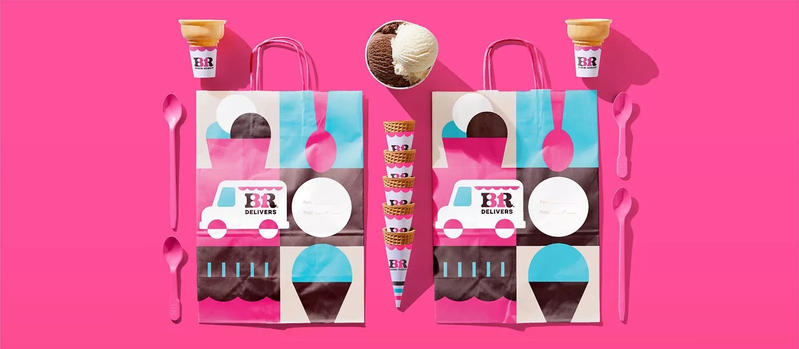 The new “BR” monogram now features a heavy serif “B” mashed together with a clumsily drawn numeral “3” next to what would seem to be a capital “R” hacksawn together with a very obvious numeral “1”. The characters take up some of the brand palette reminiscent of Dunkin Donuts, Burger King, or other brands with recent redesigns that are leaning into their sense of nostalgia.