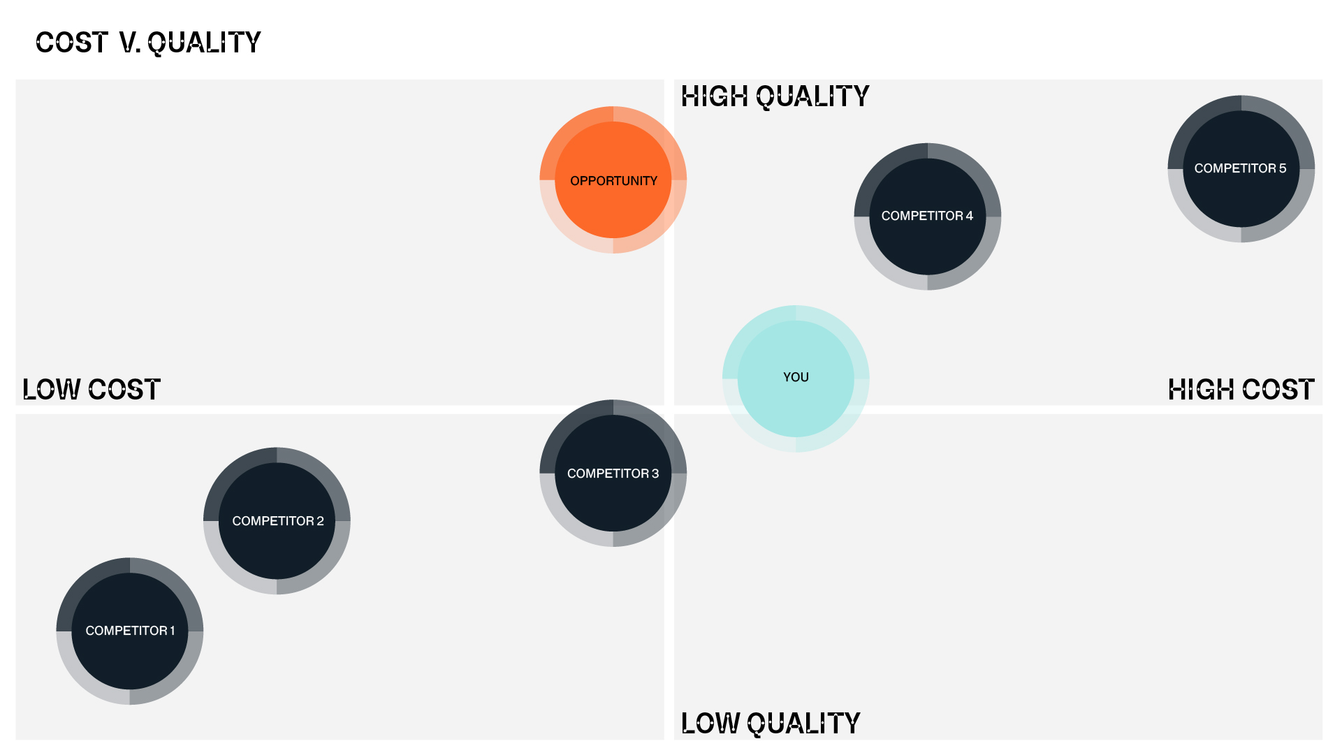 One of my favorite parts about brand analyses is developing a brand marketplace matrix. With a general idea of every brand’s positioning, grab a whiteboard and use a matrix (x and y axis) to chart the competition and yourself. This exercise will literally help you see where you lie in the marketplace.