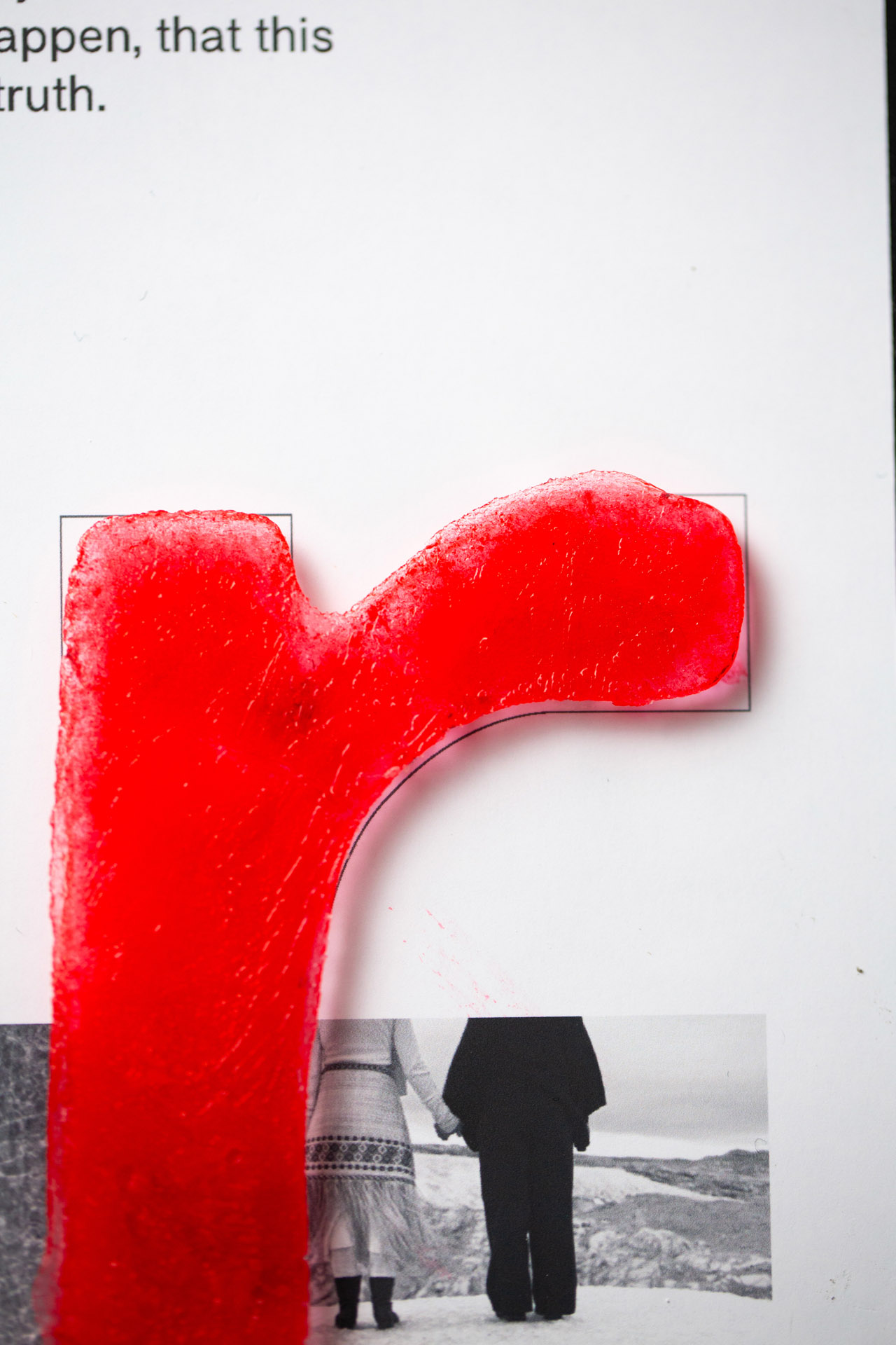 When the poster was first composed, the red letterforms were pristine, beautifully contrasting against the printed matter. But as time progressed, an intriguing transformation took place—one with a designed interruption. The ice began to melt, and the letterforms transitioned from solid to liquid, symbolizing the melting ice caps and, conversely, rising sea levels. The overlapping, muddied, and distorted red letterforms metaphorically represent the encroaching consequences of climate change, ultimately consuming the printed surface underneath.