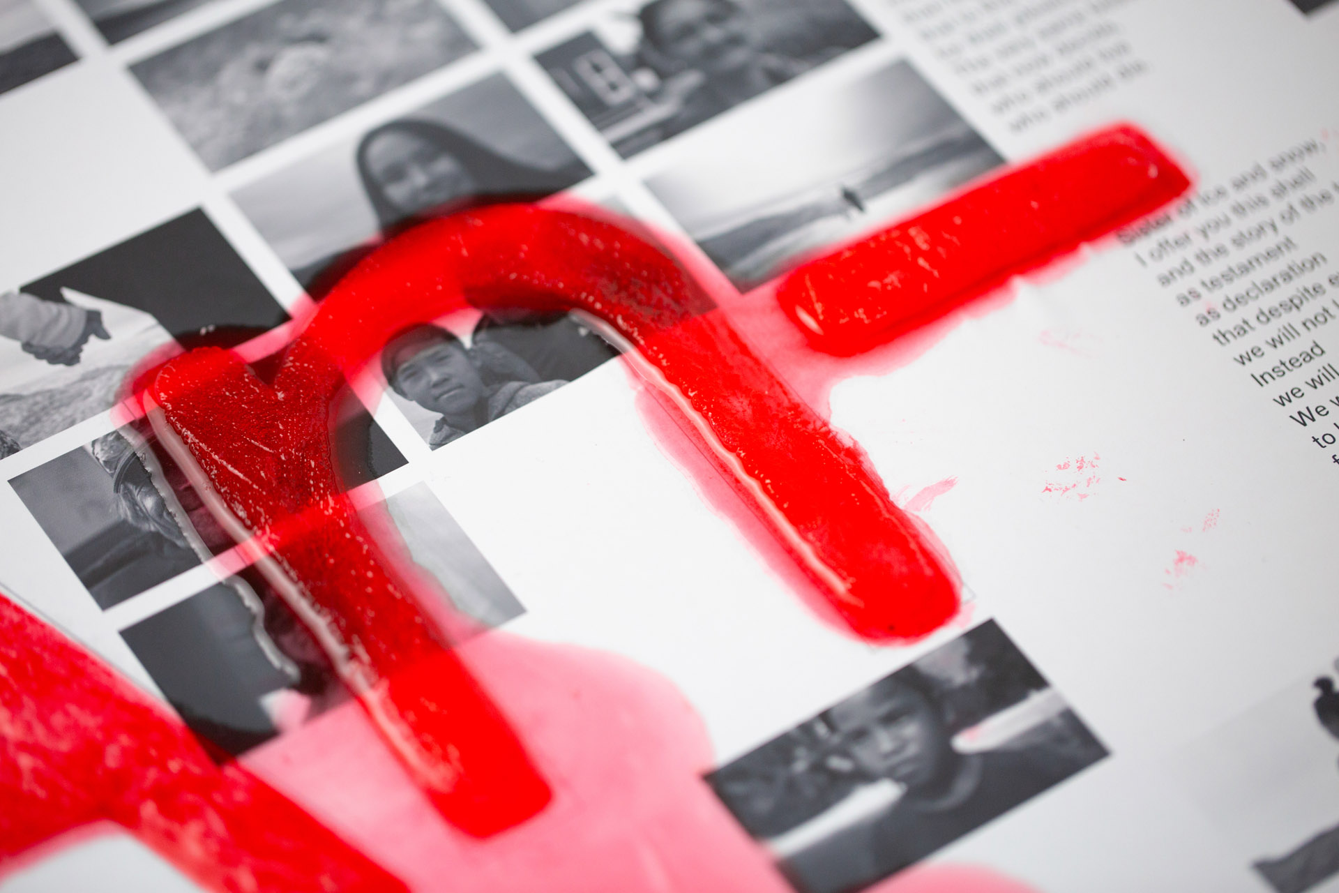 The poster itself is a composition that blends the poem "Rise" by Jetñil-Kijiner and Niviâna with stills from the video created by the poets. The typographic treatment captures the essence of the poetic verses, accentuating their emotional impact through carefully considered lines interwoven with poetic prose. However, what sets the poster apart is the incorporation of a tangible, dynamic element—red letters cast in ice from Caeli’s original molds.