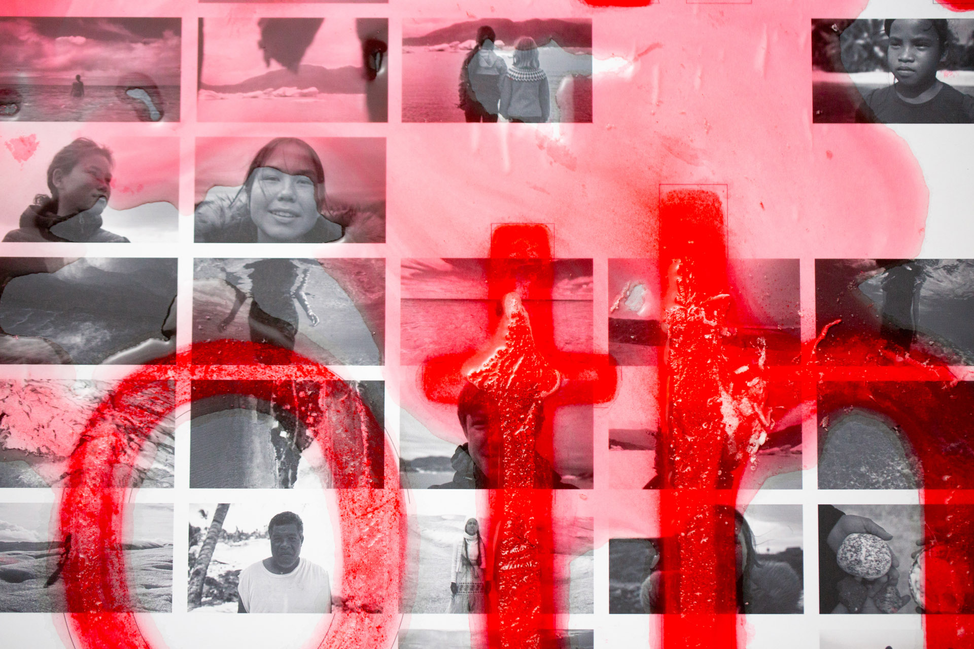 The poster itself is a composition that blends the poem "Rise" by Jetñil-Kijiner and Niviâna with stills from the video created by the poets. The typographic treatment captures the essence of the poetic verses, accentuating their emotional impact through carefully considered lines interwoven with poetic prose. However, what sets the poster apart is the incorporation of a tangible, dynamic element—red letters cast in ice from Caeli’s original molds.