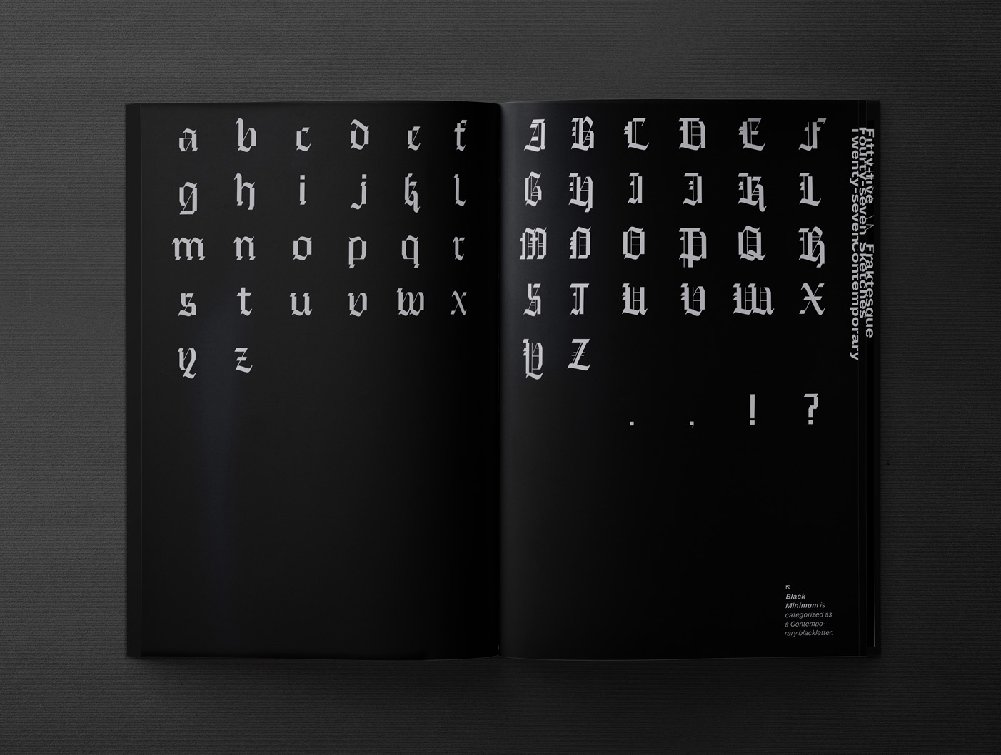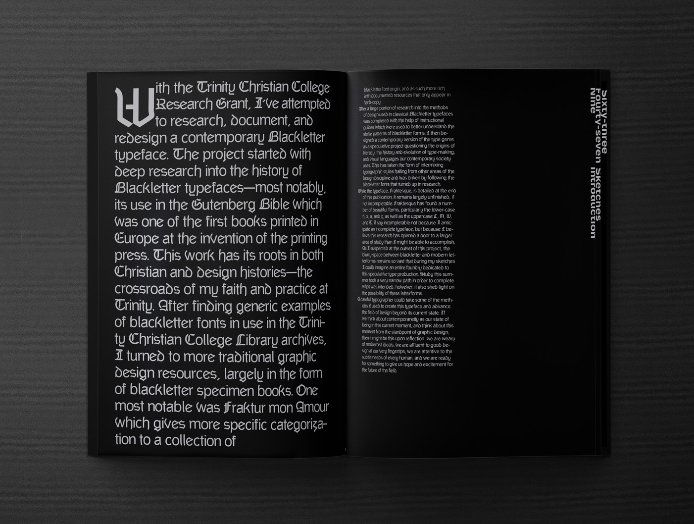 Blackletter as a typographic style has largely been left dormant since the Medieval era. With its rich history—appearing in the first written manuscripts of the Bible—and inconspicuous cultural connotations—it adorns many “official documents” ranging from The Declaration of Independence to college degrees—it’s confounding that no designer has taken on the challenge of bringing its visual style to the contemporary era. It’s a shame, really, of the typographic discipline. In this project for the Trinity Christian College Summer Research Grant, I outlined the historical track of blackletter typefaces, its cultural connotations both past, present, and potential, and the wave of type design that swept up every other typographic category except blackletter.
