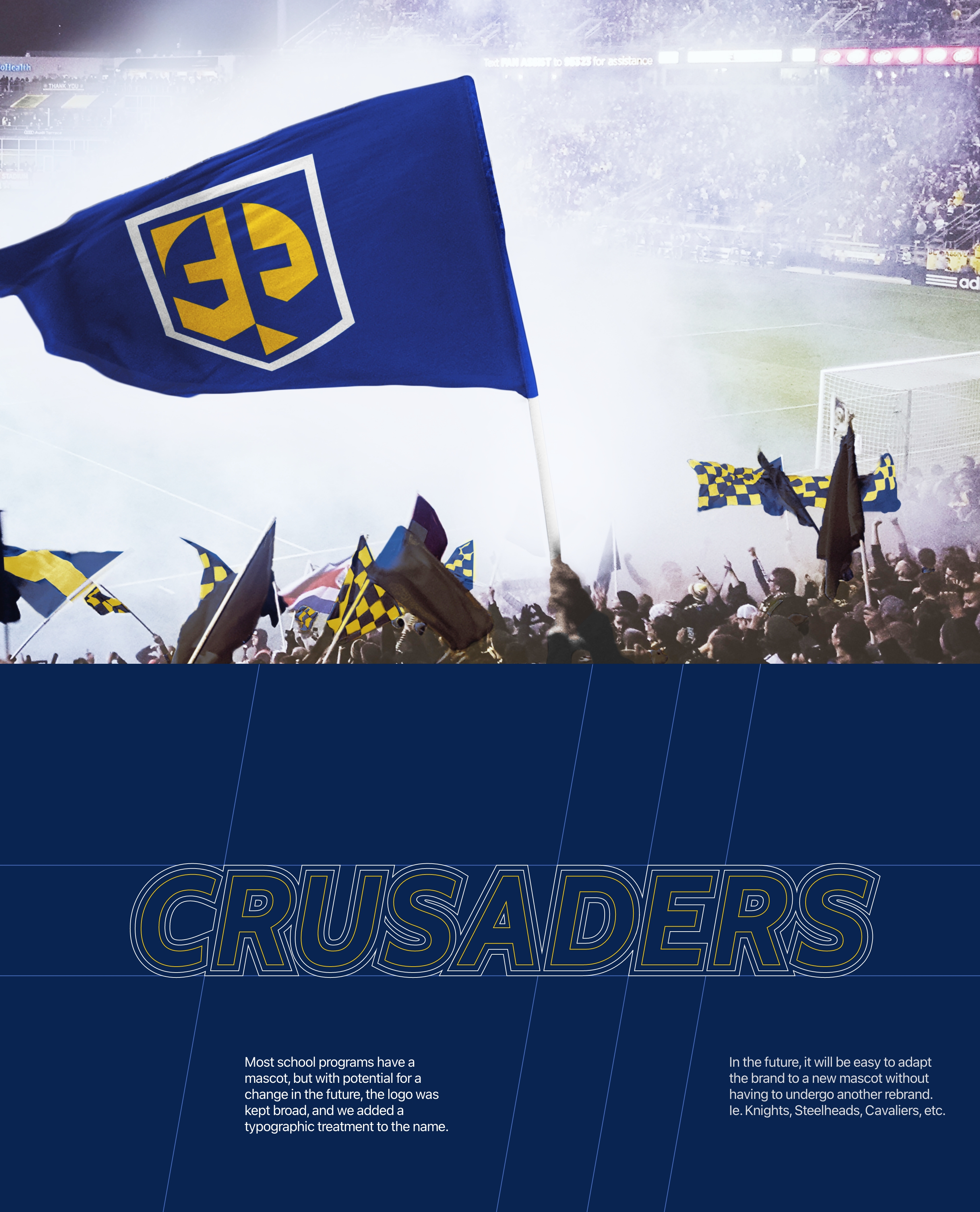 Pen and Lens developed a simple crest. The shield shape and arch through the middle serve to allude to a knight’s armor—a nod to the school’s mascot, a Crusader. Unlike other school brands, however, this logo serves to identify both academic and athletic branches of the school system. The crest then succinctly marries the crusader elements with a prominent ‘W’, and a cross at the center after the school motto, “Where Christ is Central.”