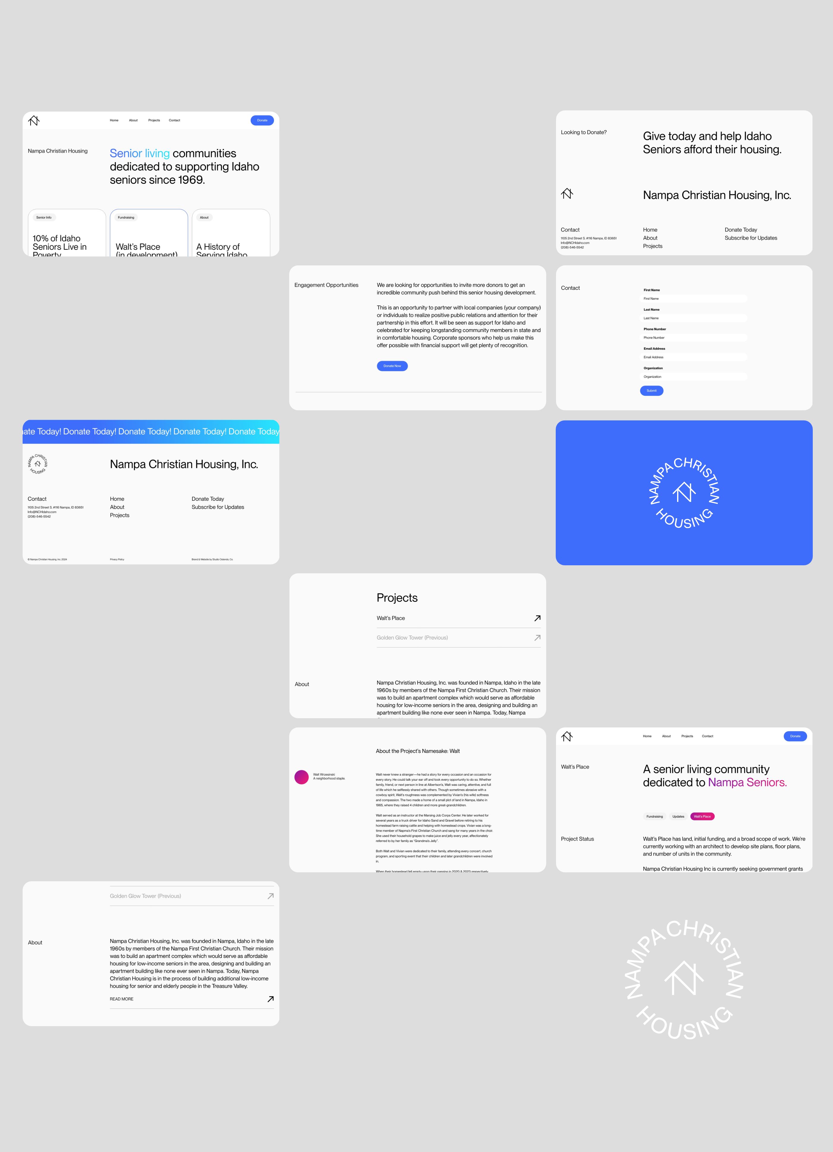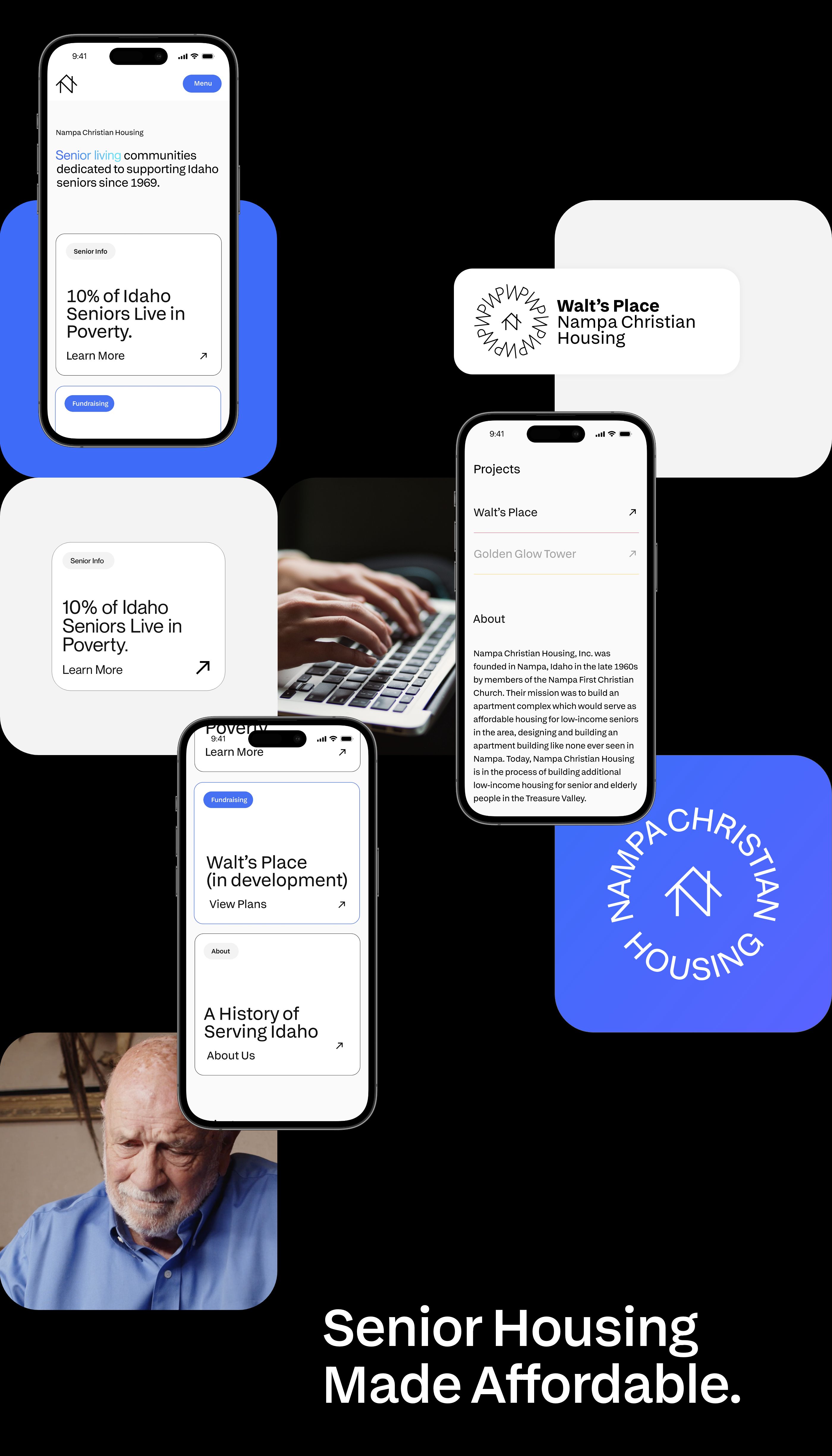 For Nampa Christian Housing, we wanted to design an identity that was approachable, celebratory, that created community, and was easy to access given the average user is over 55 years old.