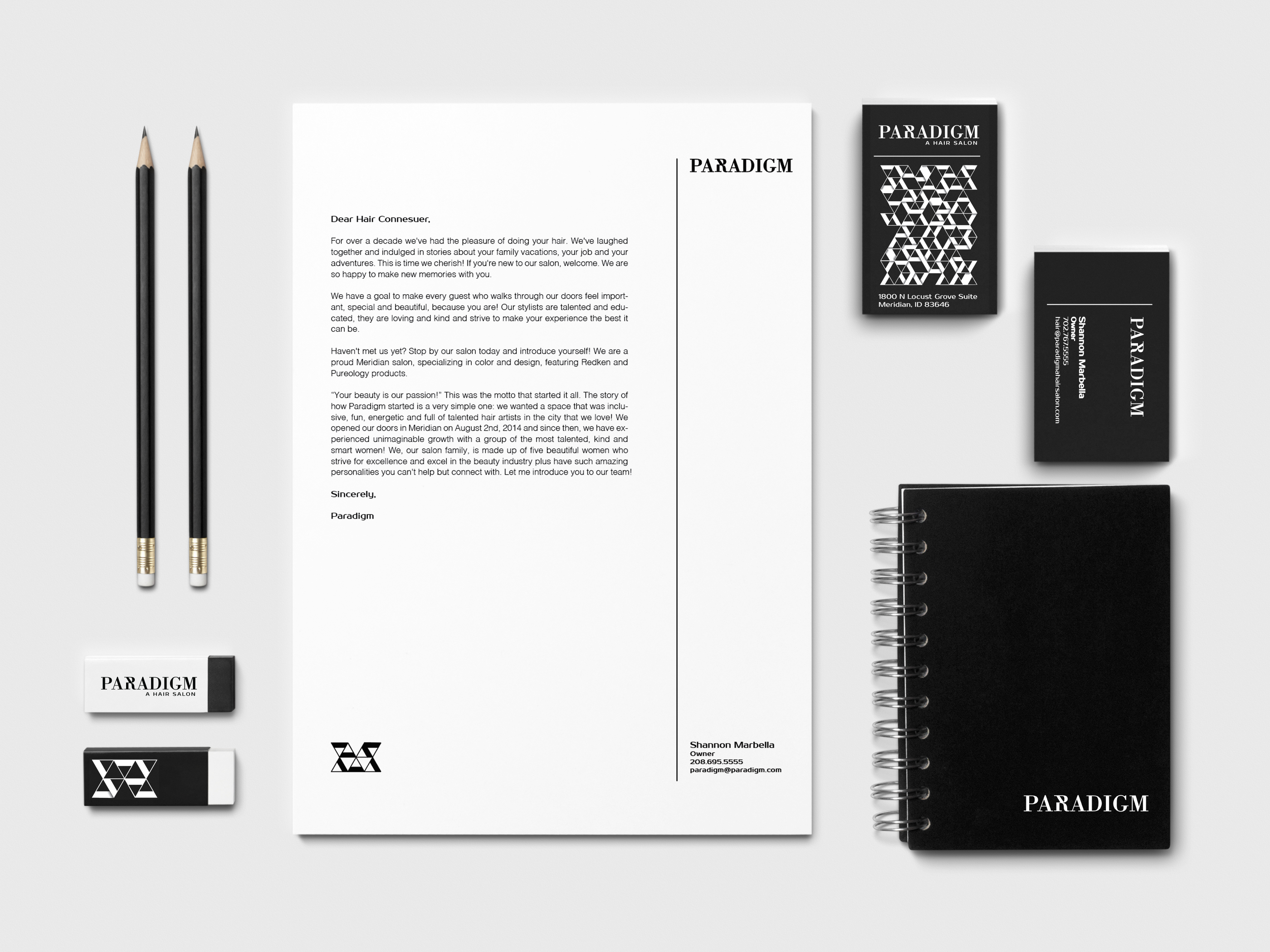 Paradigm, A Hair Salon, was founded by two women in Meridian, Idaho. After years of experience working at other salons, the women of Paradigm saw an opportunity for a high-end, luxurious hair and beauty salon in the Boise area. Their salon needed to look as sharp as the founding women—women constantly perfecting their beauty techniques.