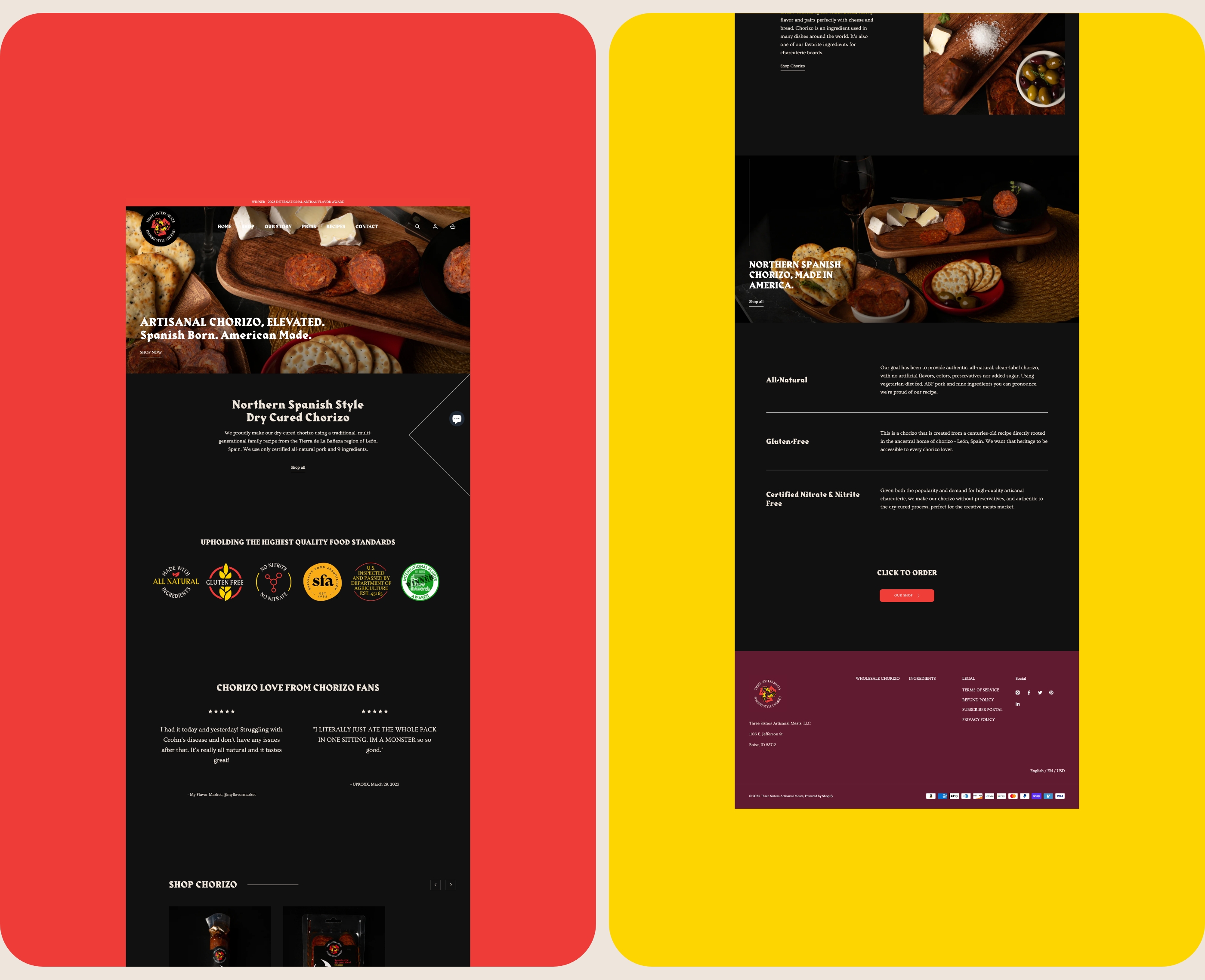 To help launch his product, we conducted a brand photography shoot. For chorizo, it was all about the product—showing-off the flavors, the simple ingredients, and helping customers envision when and where they'd likely enjoy Three Sisters dry cured chorizo. The brand photos were used in at least 60 days of social media content, used in pitch decks to investors, and on the website.
